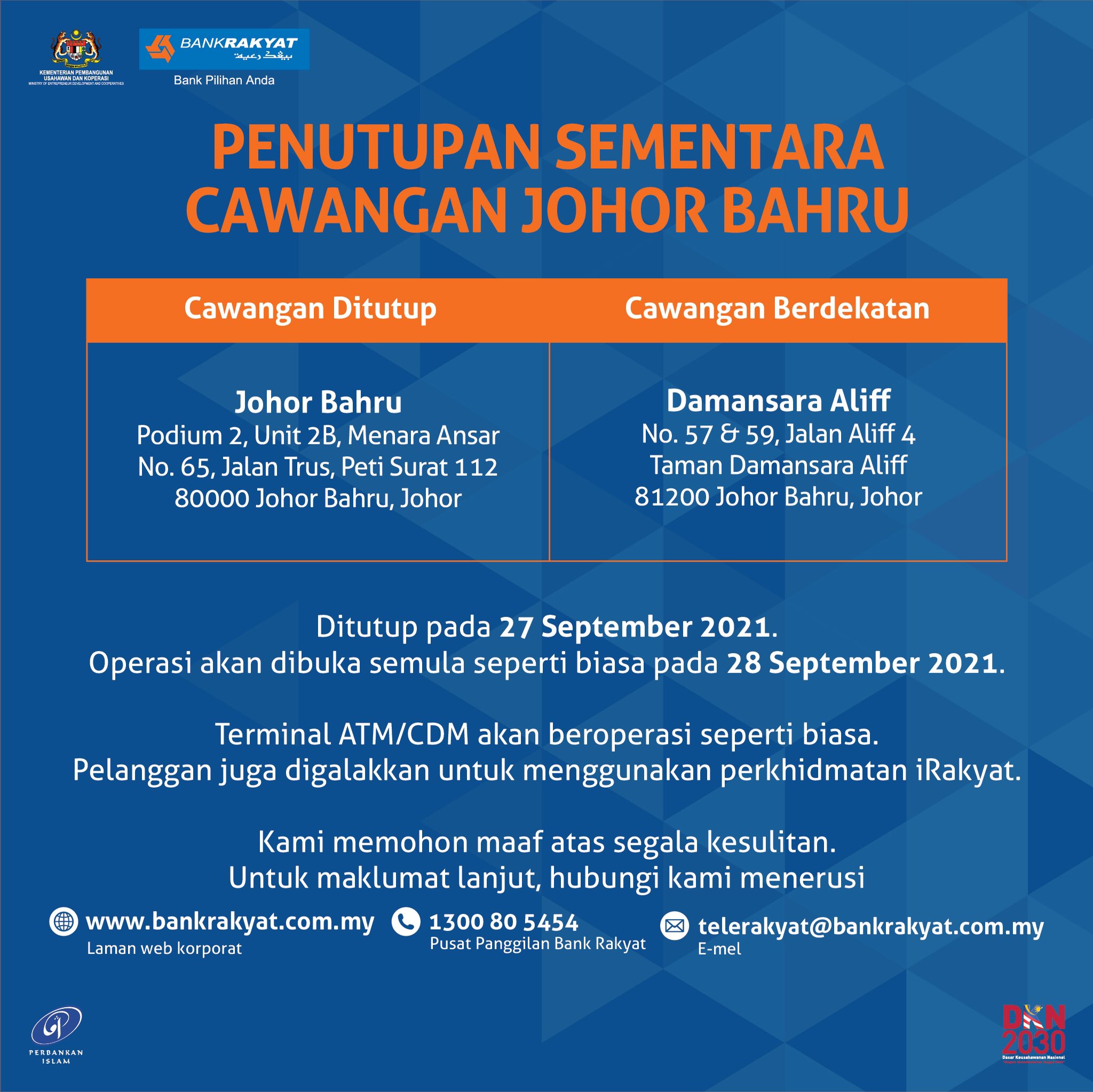Bank Rakyat Pelanggan Yang Dihargai Sila Ambil Maklum Berkaitan Penutupan Sementara Pusat Pembiayaan Auto Johor Bahru Pada 10 September 2021 Operasi Akan Dibuka Semula Pada 14 September 2021 Seperti Yang Dinyatakan